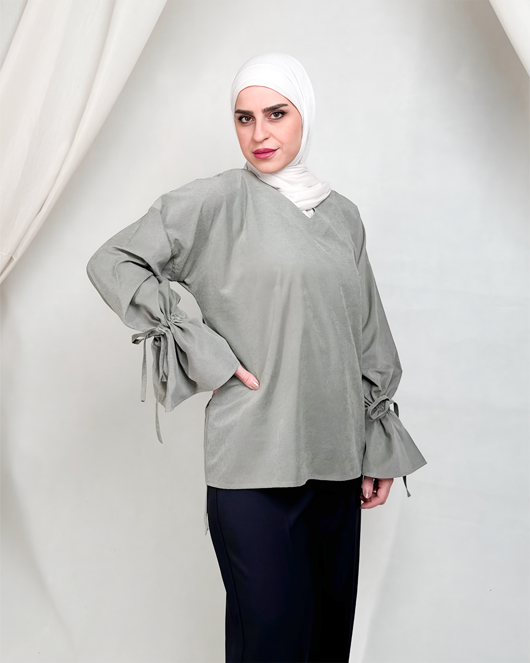 فستان أنيق بلون أزرق ضبابي ناعم، يتميز بتصميم فضفاض يعكس الراحة والرقي في آنٍ واحد. الكمّات مزينة بتفاصيل شدّ أنيقة (رباطات قابلة للتعديل) تمنح لمسة فريدة وعصرية. الخامة ناعمة على البشرة وتناسب مختلف الإطلالات اليومية والرسمية.