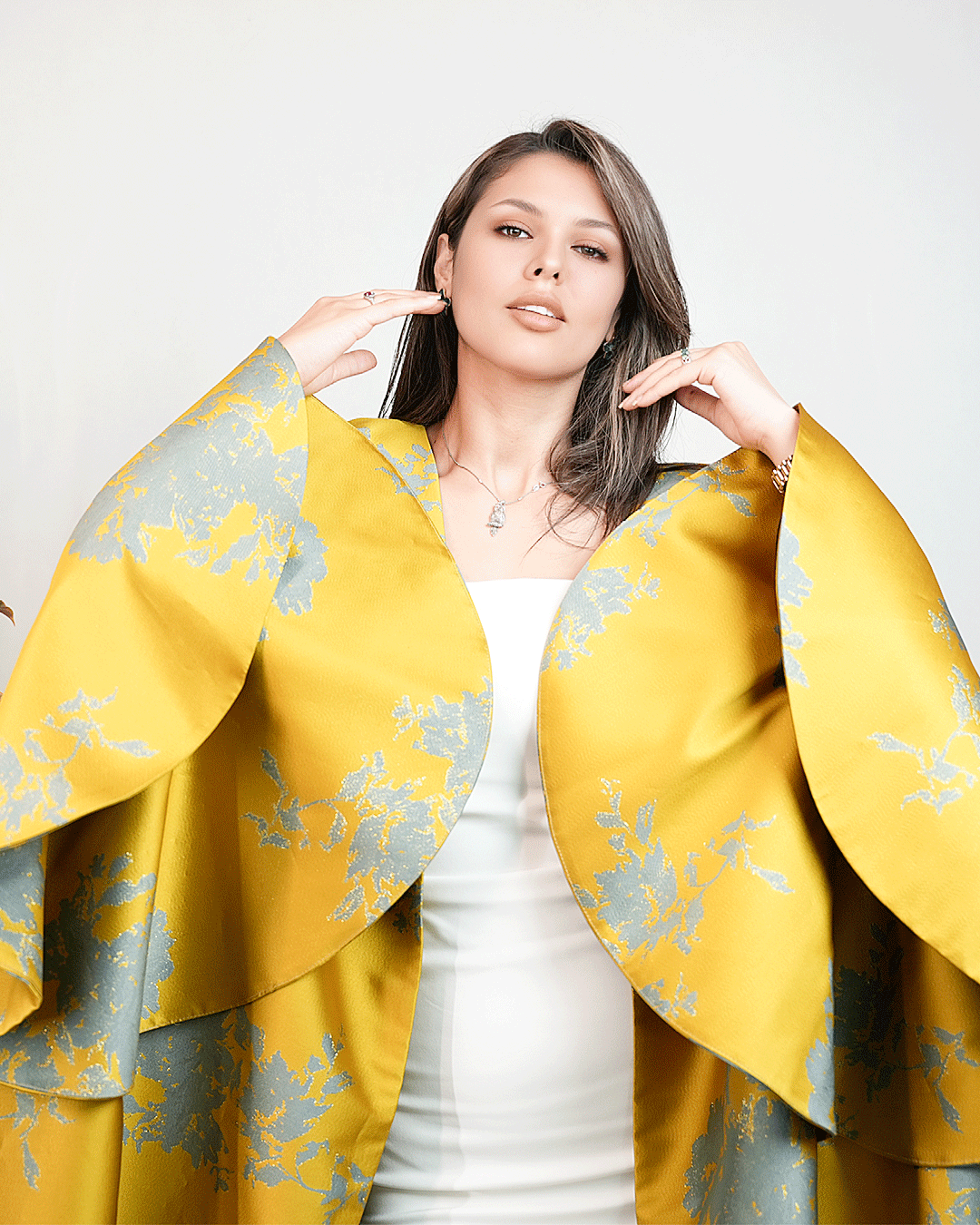 تصميم الأكمام المتعددة الطبقات (الكشكش العريض) يعطي حجم أنثوي فاخر، بينما قصة العباية المفتوحة تعطي مرونة بالتنسيق سواء مع فستان أو بدلة بسيطة تحتها.
