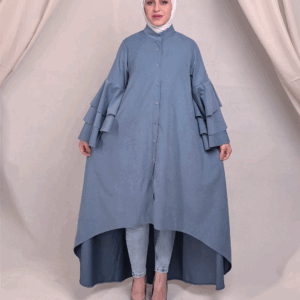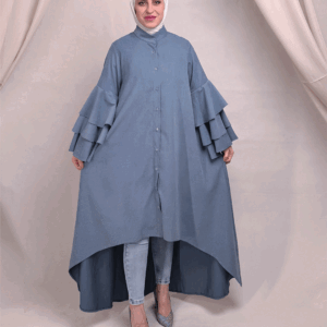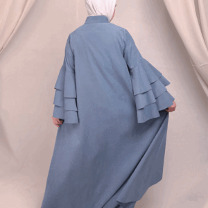 تصميم الأكمام المتعددة الطبقات (الكشكش العريض) يعطي حجم أنثوي فاخر، بينما قصة العباية المفتوحة تعطي مرونة بالتنسيق سواء مع فستان أو بدلة بسيطة تحتها.