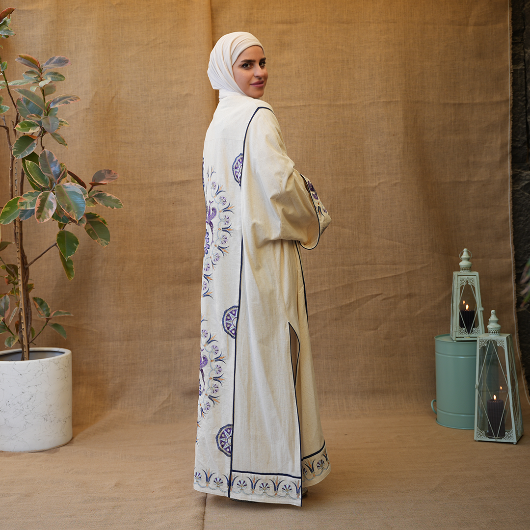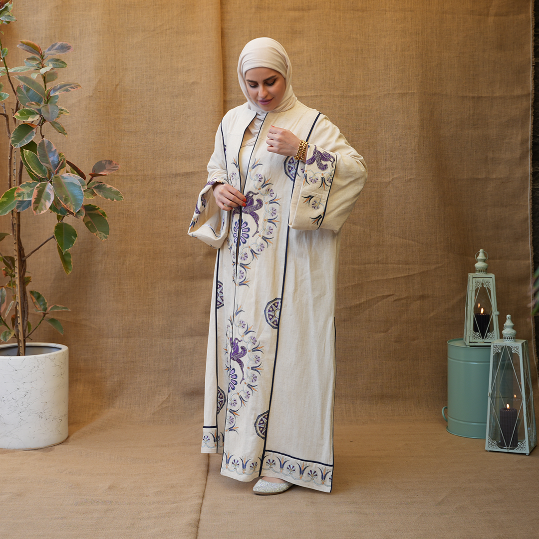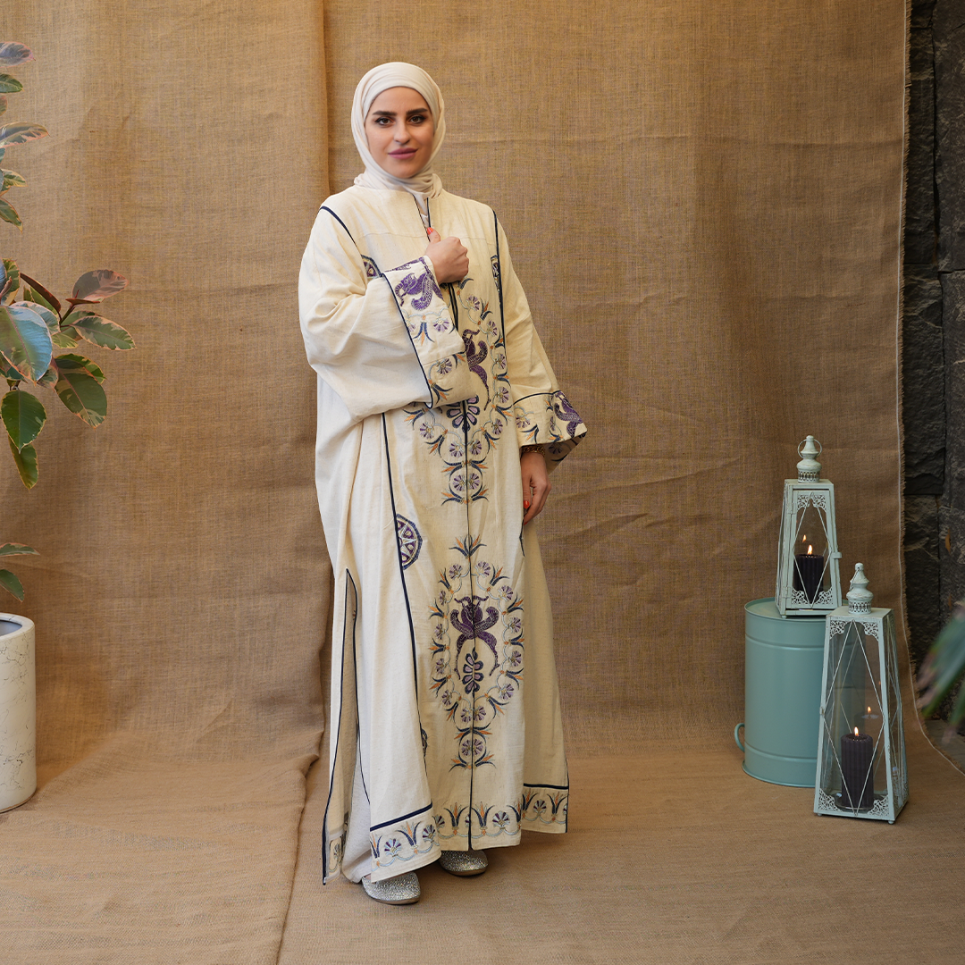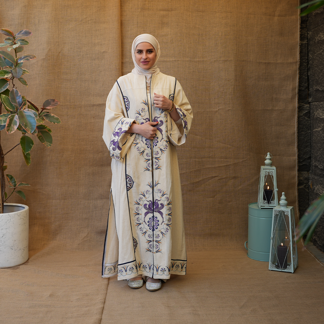 مزينة بتطريزات دقيقة بألوان بنفسجية مع لمسات كحلي، تعطي توازن جميل بين البساطة والفخامة.