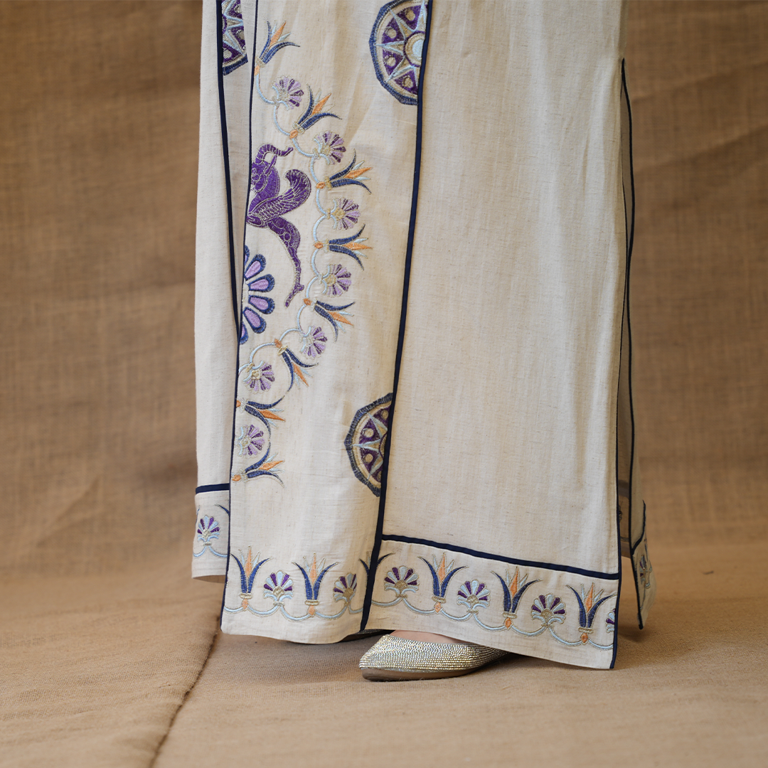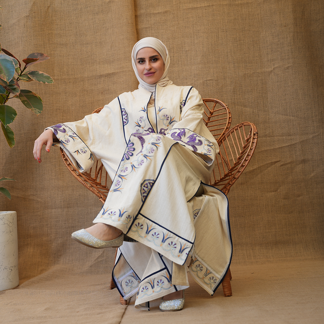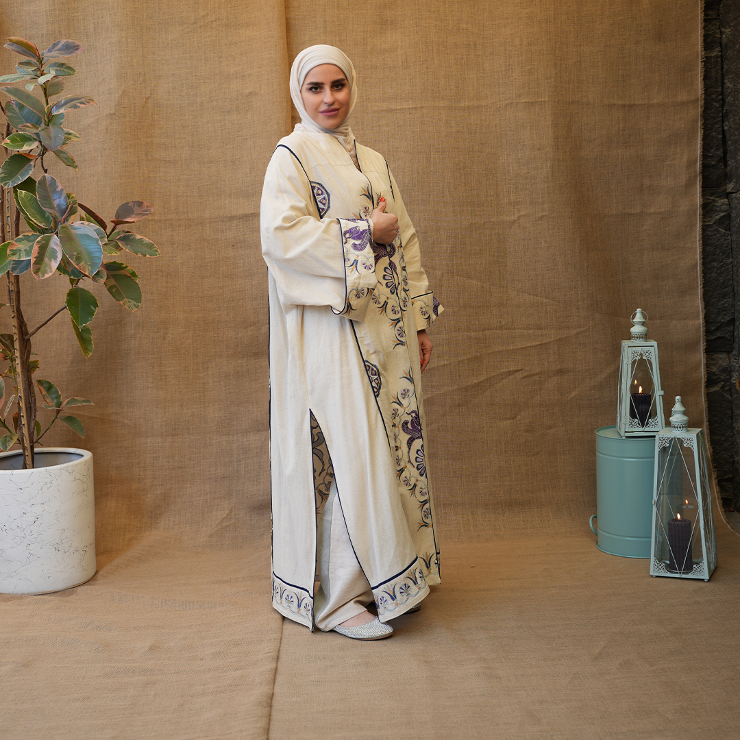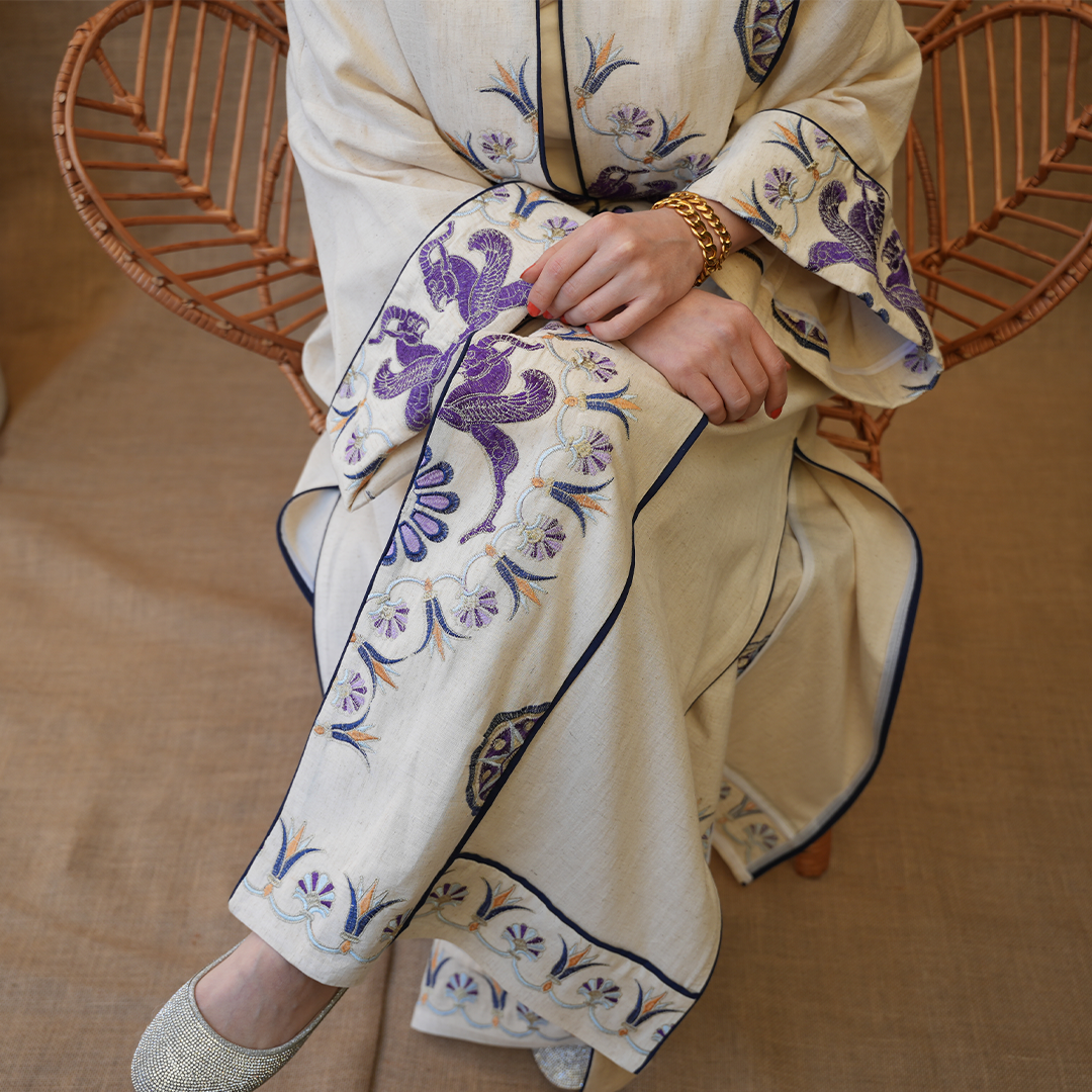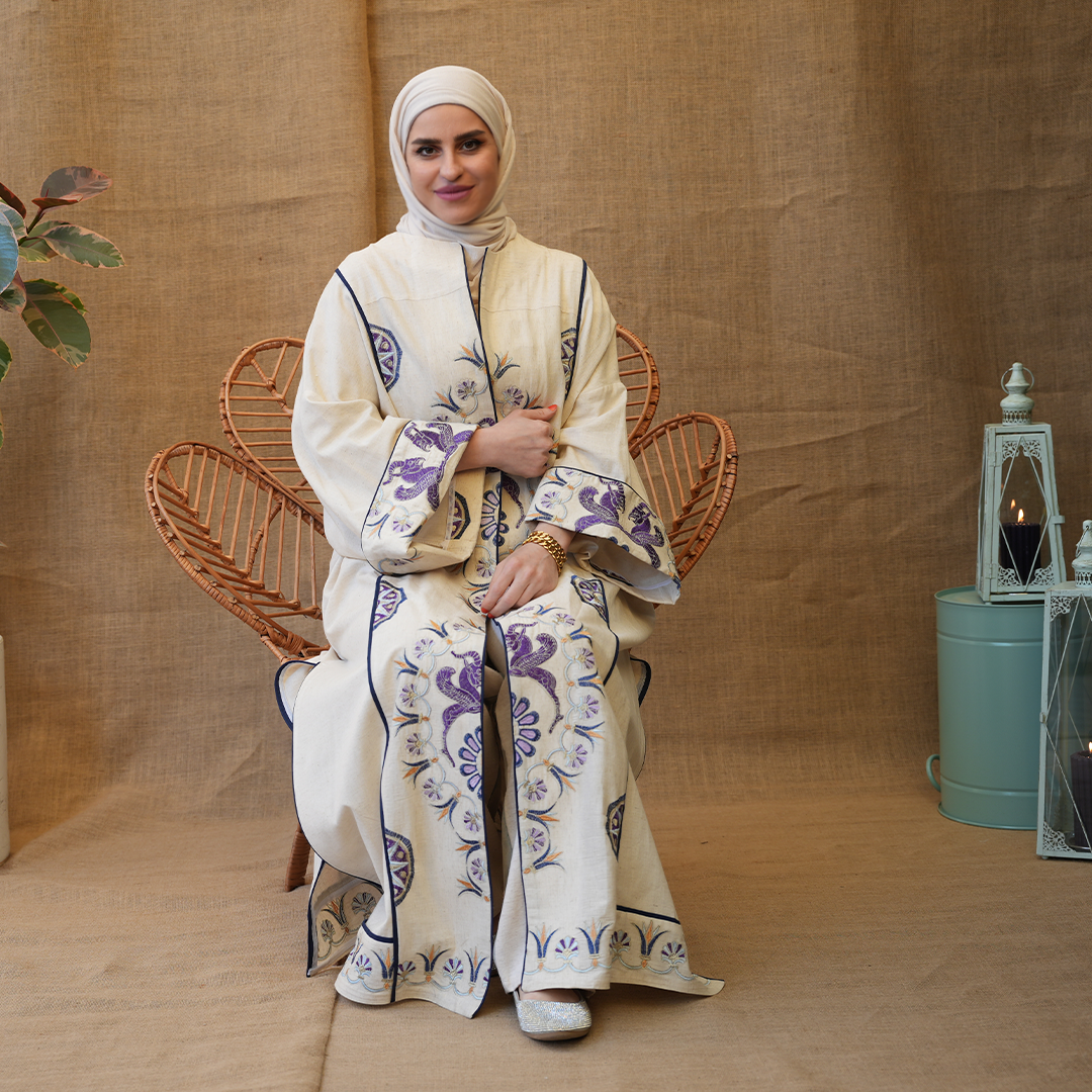 مزينة بتطريزات دقيقة بألوان بنفسجية مع لمسات كحلي، تعطي توازن جميل بين البساطة والفخامة.
