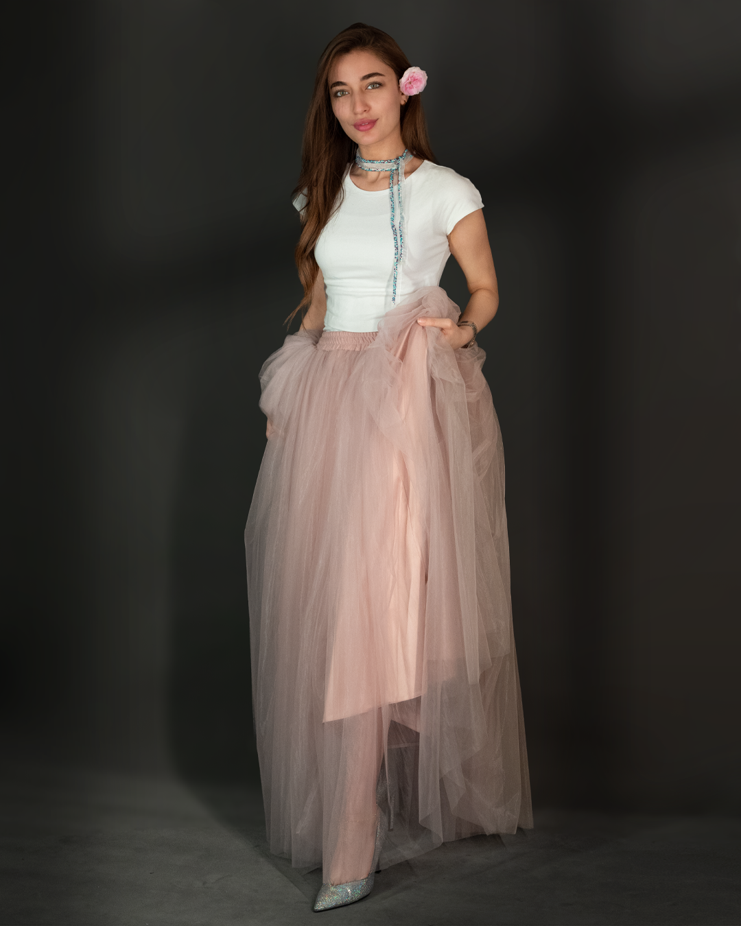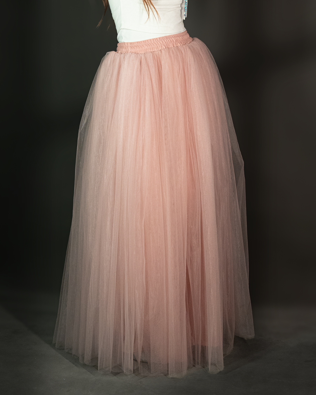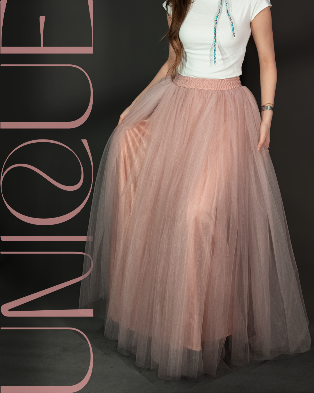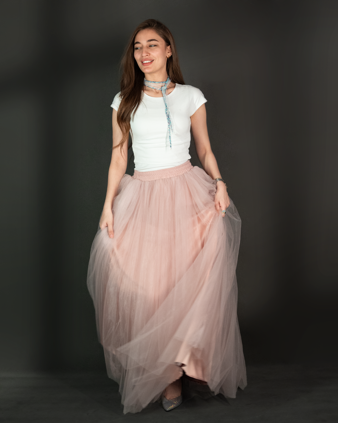 تنورة تول (Tulle Skirt) طويلة بقصّة واسعة وانسيابية، مصممة بطبقات خفيفة تعطي حجم وحركة أنثوية بكل خطوة