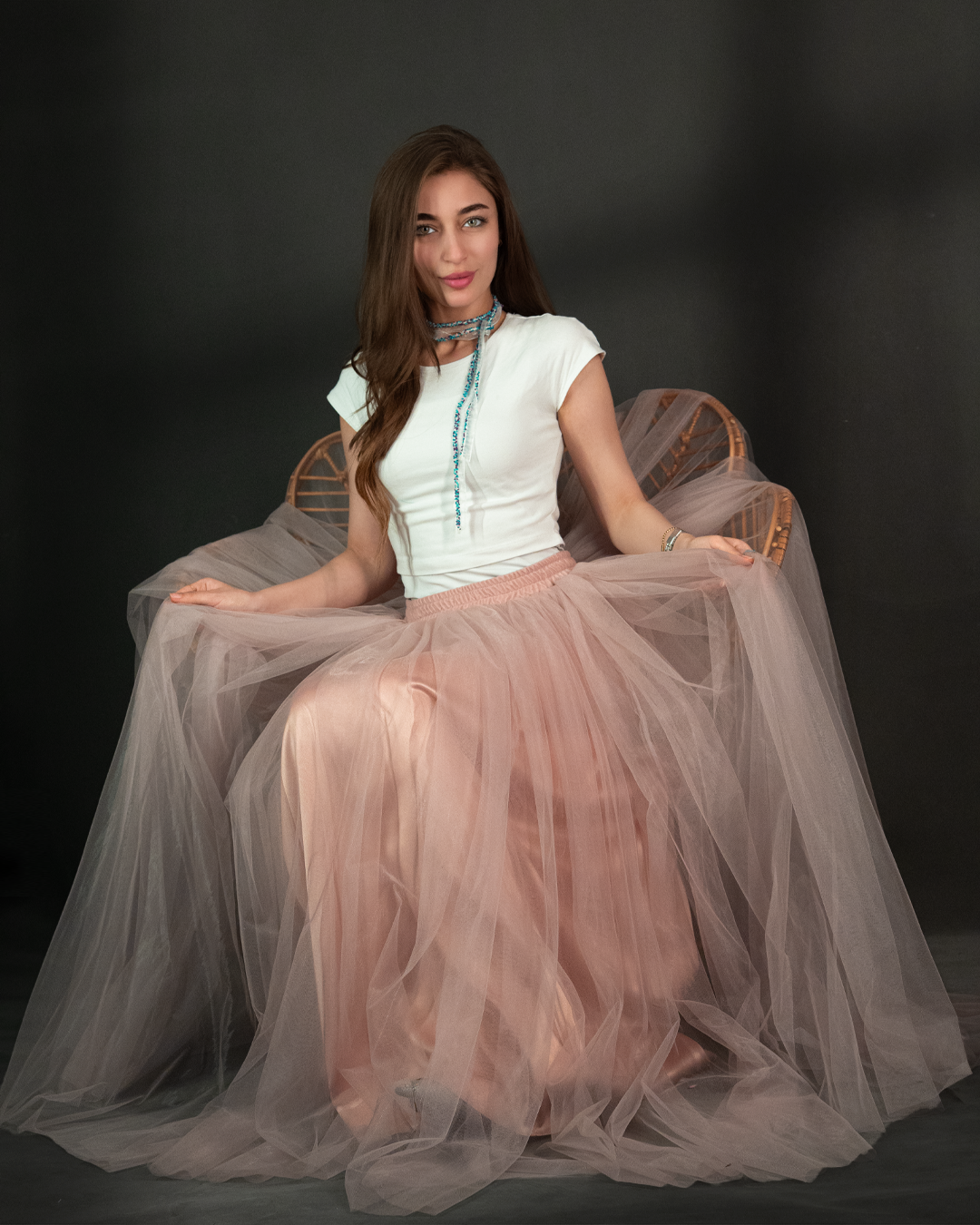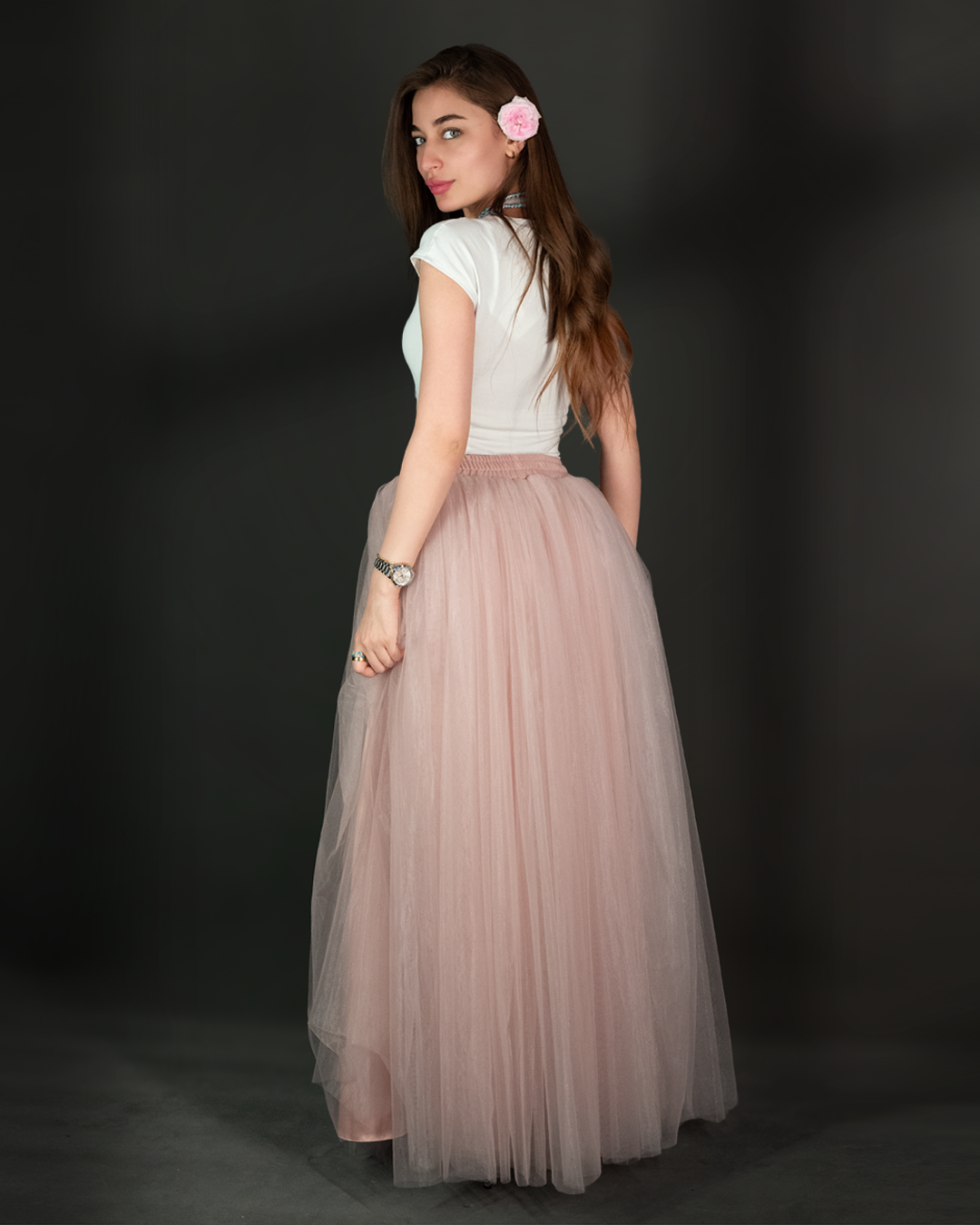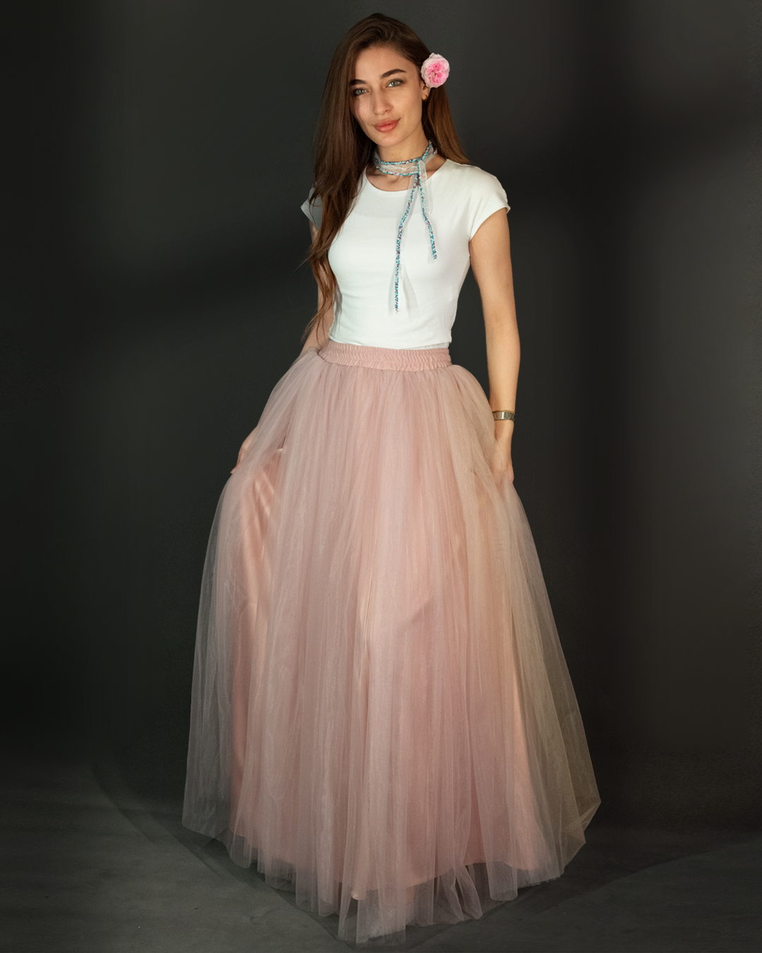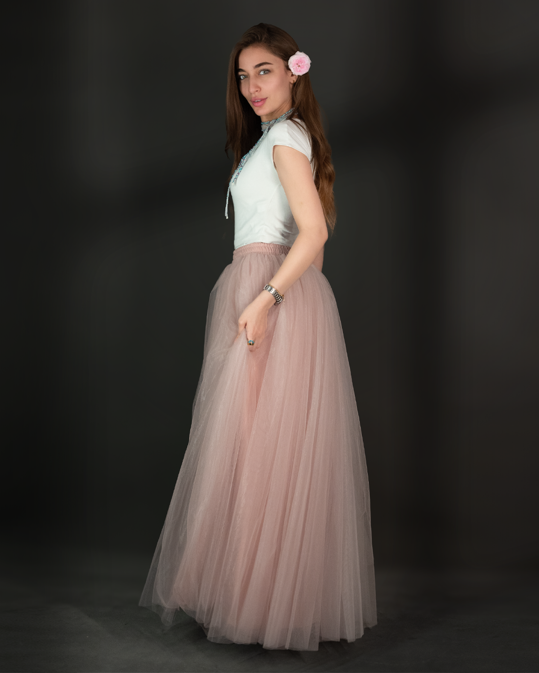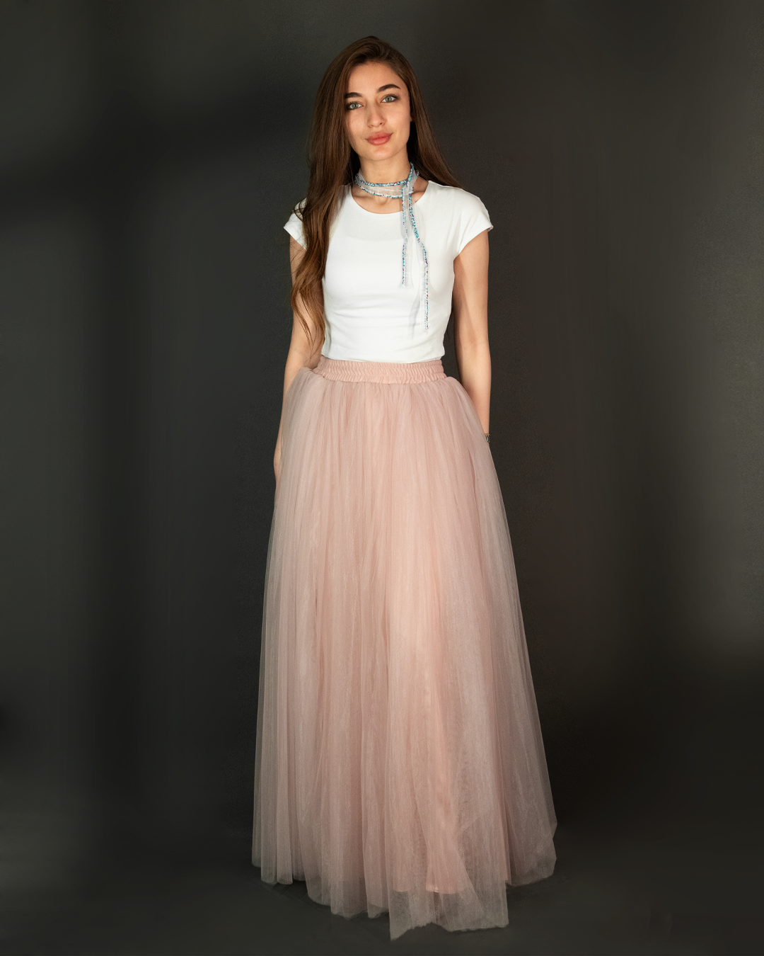 تنورة تول (Tulle Skirt) طويلة بقصّة واسعة وانسيابية، مصممة بطبقات خفيفة تعطي حجم وحركة أنثوية بكل خطوة