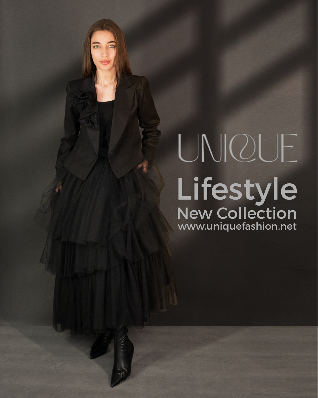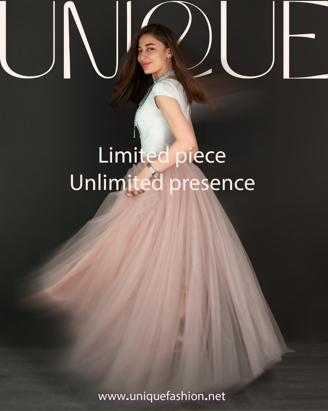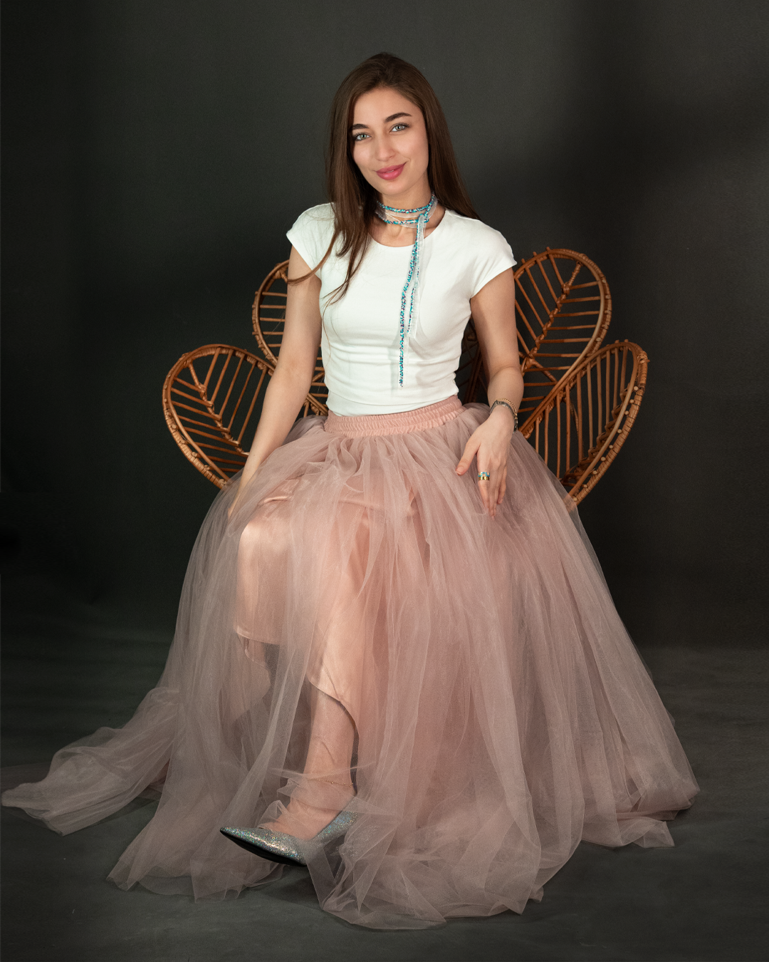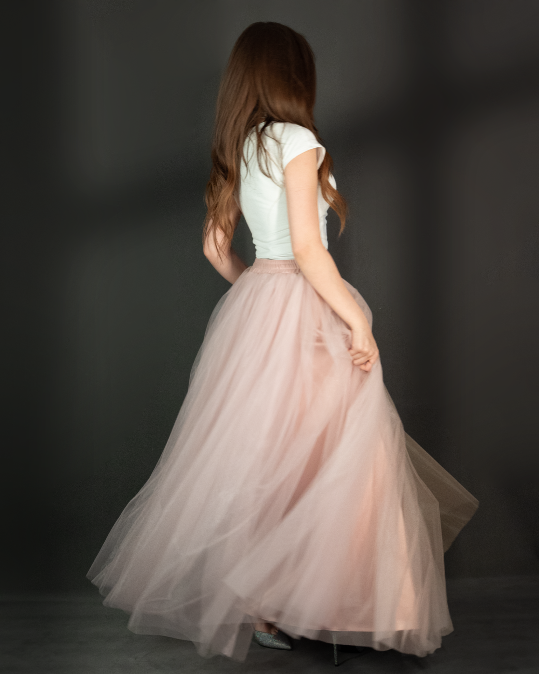 تنورة تول (Tulle Skirt) طويلة بقصّة واسعة وانسيابية، مصممة بطبقات خفيفة تعطي حجم وحركة أنثوية بكل خطوة