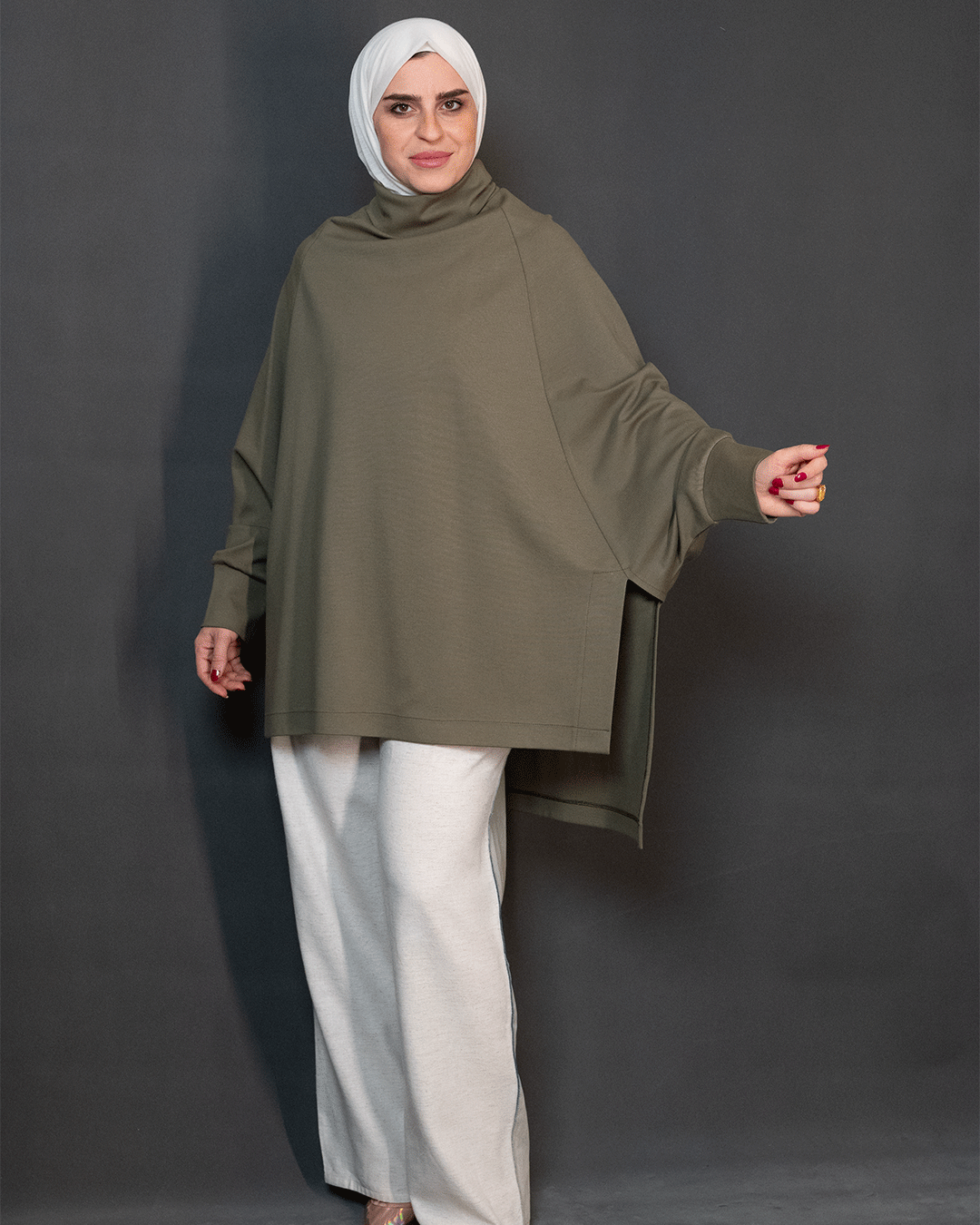 يتميّز بقصة واسعة وأكمام تضيف لمسة فخامة، مع ربطة الكتف الكبيرة يصير الخيار المثالي لإطلالة راقية تلفت النظر بكل بساطة