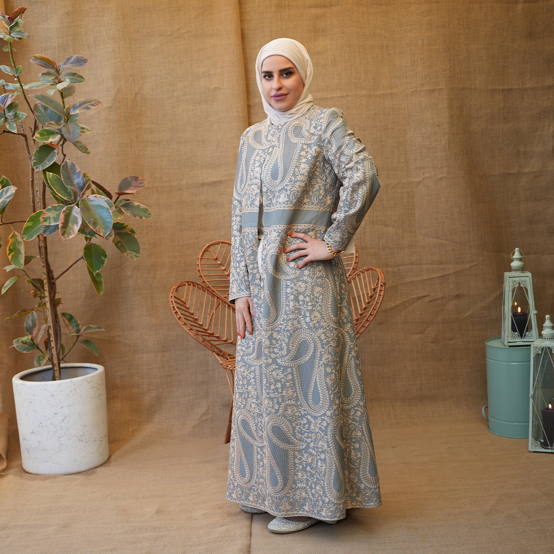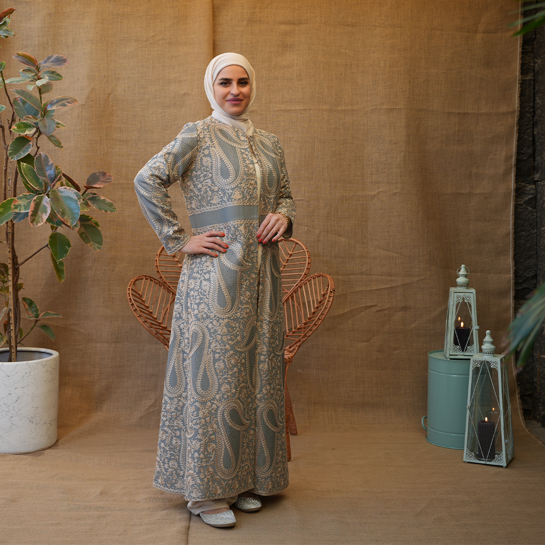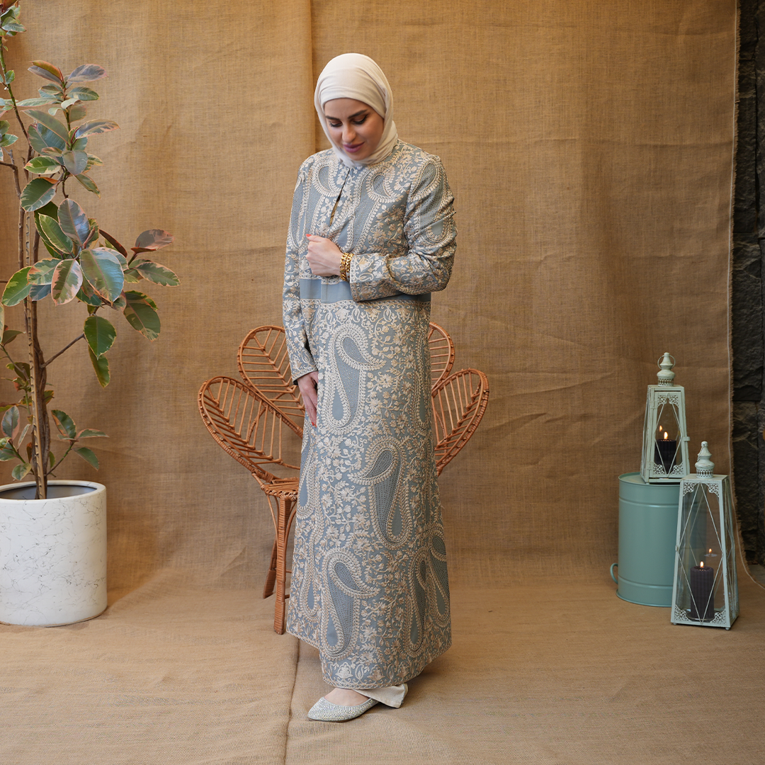 بشت طويل بتصميم راقٍ يجمع بين الكلاسيكية والفخامة، مصنوع من قماش منقوش بزخارف ناعمة مستوحاة من النقوش الشرقية. يتميز بقصّة مستقيمة مريحة مع خصر محدد القوام ويمنح توازناً أنيقاً للتصميم. الأكمام طويلة والياقة مغلقة.