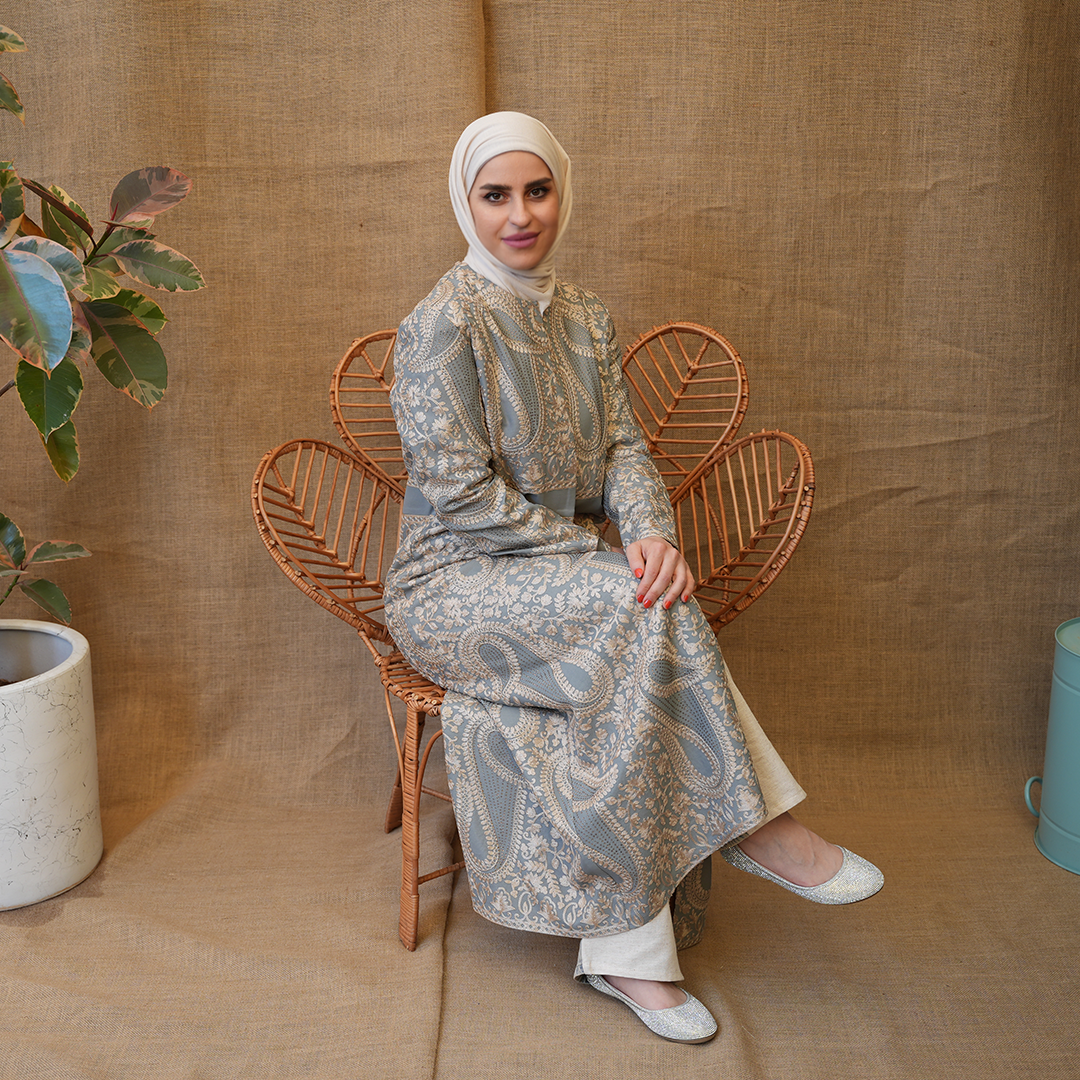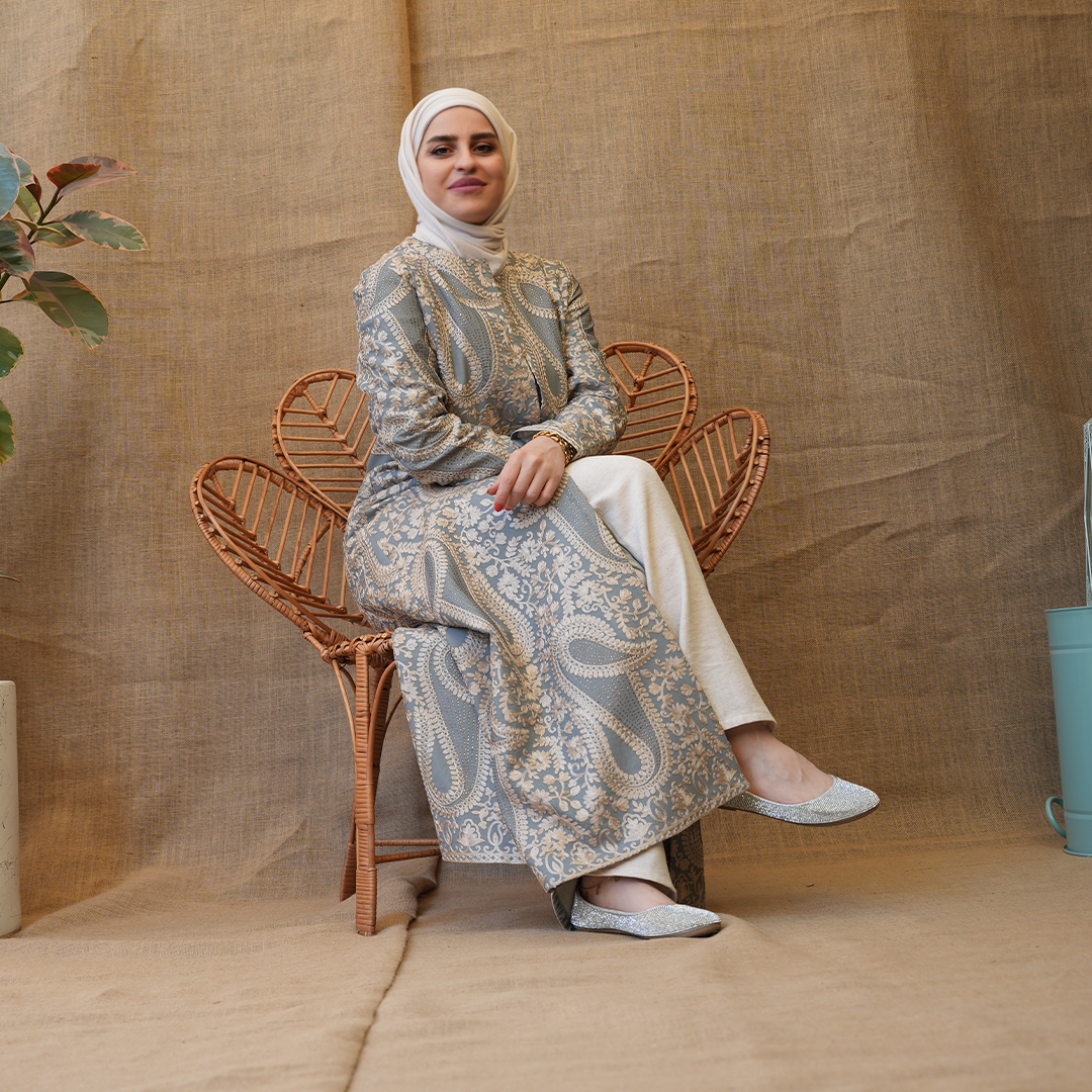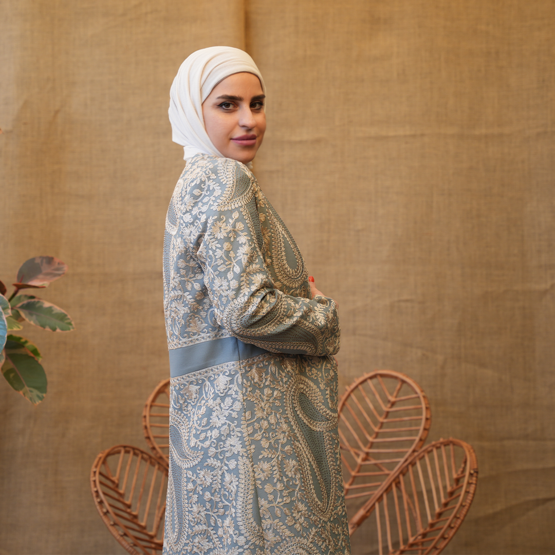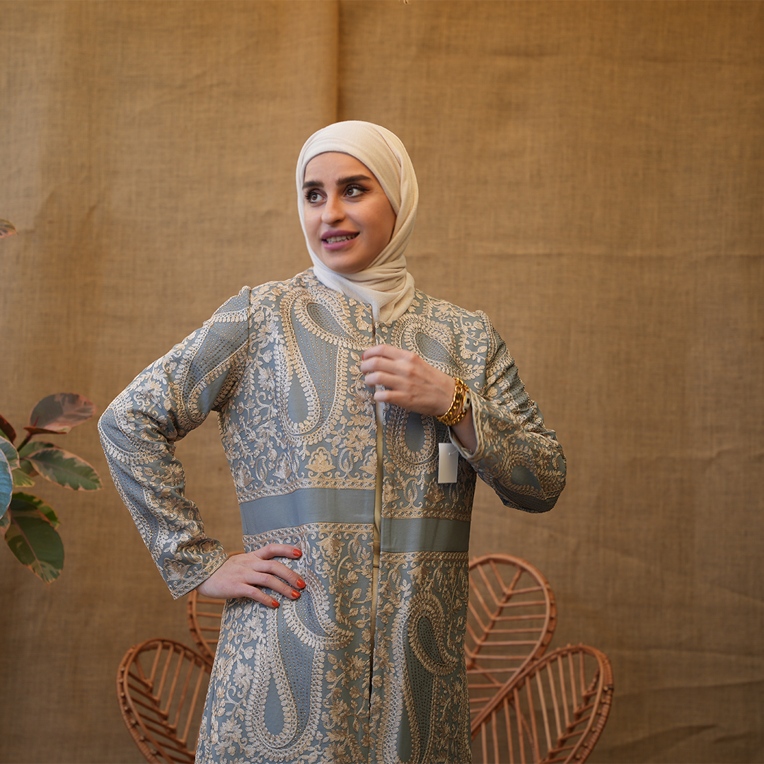 بشت طويل بتصميم راقٍ يجمع بين الكلاسيكية والفخامة، مصنوع من قماش منقوش بزخارف ناعمة مستوحاة من النقوش الشرقية. يتميز بقصّة مستقيمة مريحة مع خصر محدد القوام ويمنح توازناً أنيقاً للتصميم. الأكمام طويلة والياقة مغلقة.