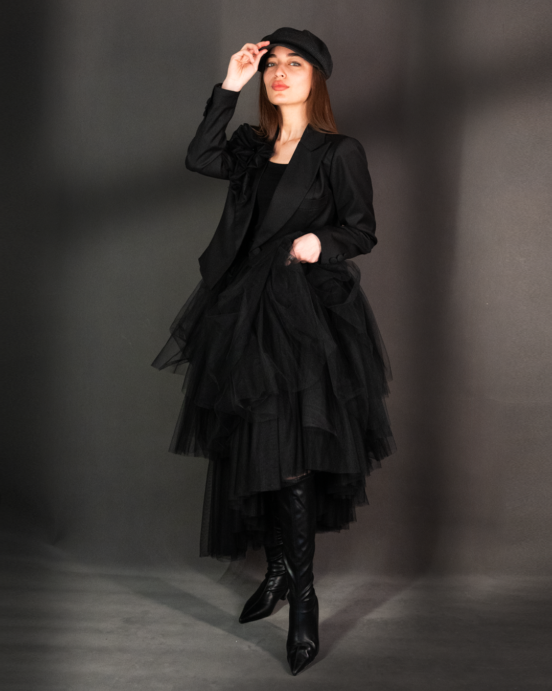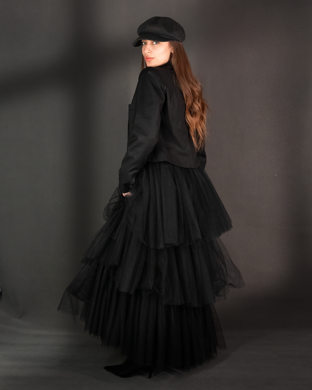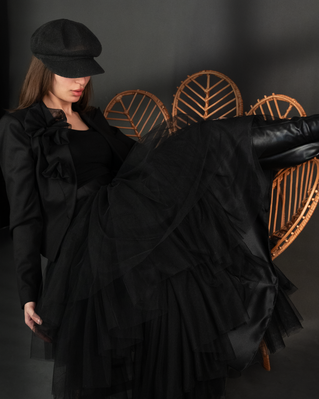 تنورة تول (Tulle Skirt) متعددة الطبقات، بقصّة منفوشة تُعرف أيضاً بأسلوب Tiered / Layered Tulle Skirt أو أقرب لستايل Tutu Skirt لكن بشكل أكثر راقي وناعم