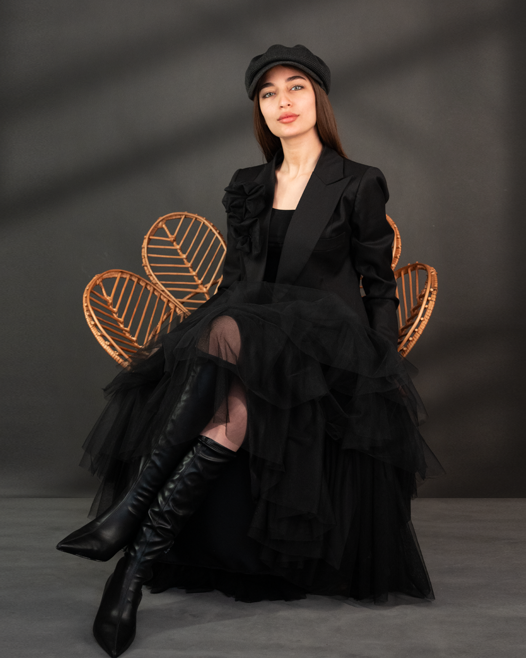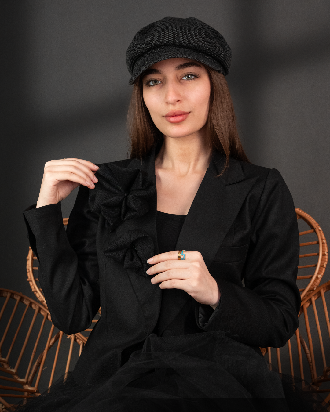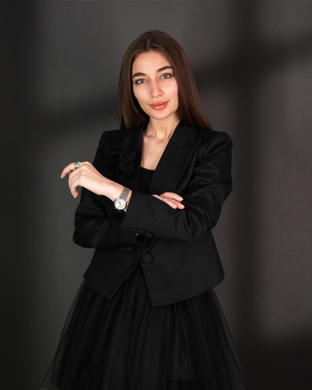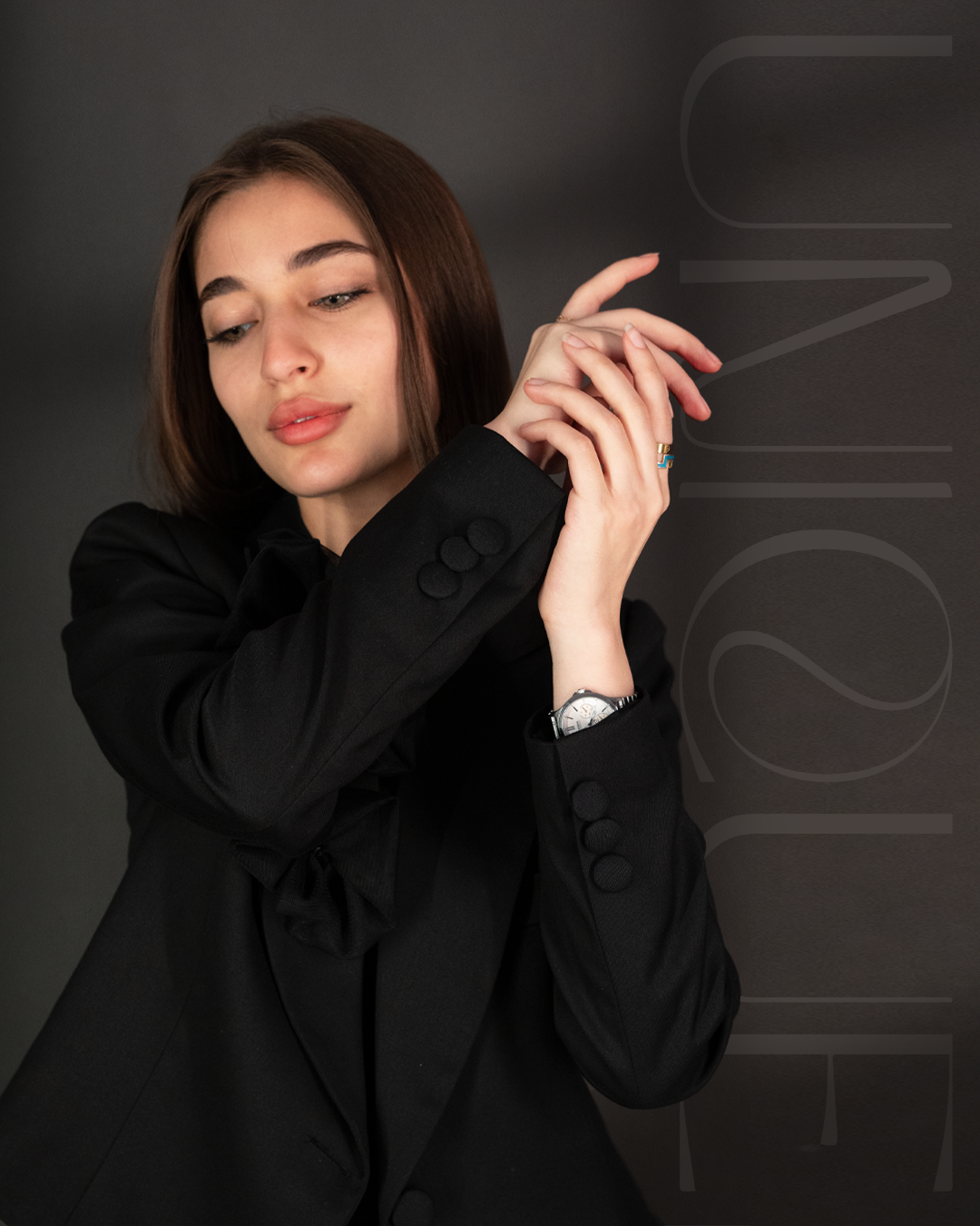 سترة قصيرة (Cropped Blazer) بقصّة أنيقة وخطوط نظيفة، مصنوعة من خامة ناعمة عالية الجودة تعطي شكل مرتب وثابت طول اليوم، مع تفاصيل ناعمة تضيف لمسة فخمة بدون مبالغة.