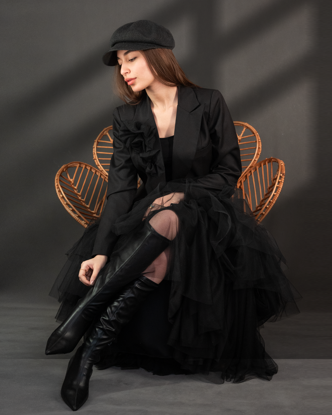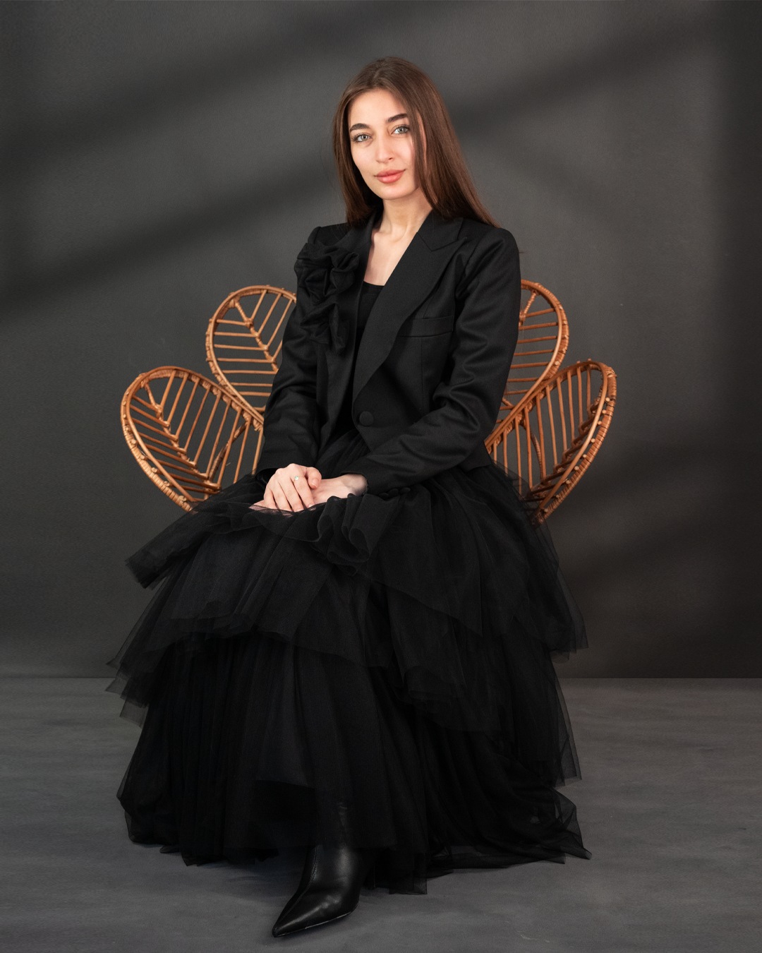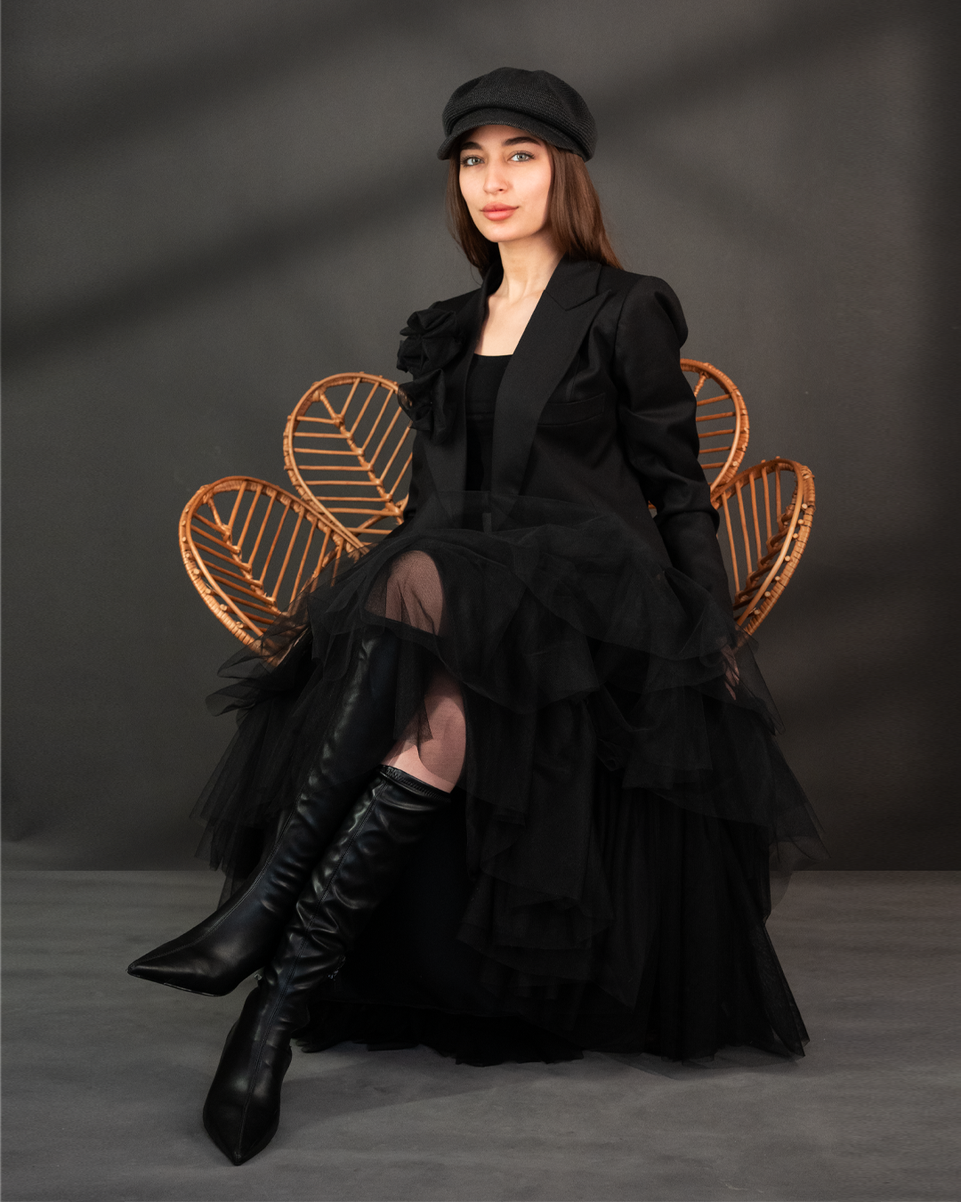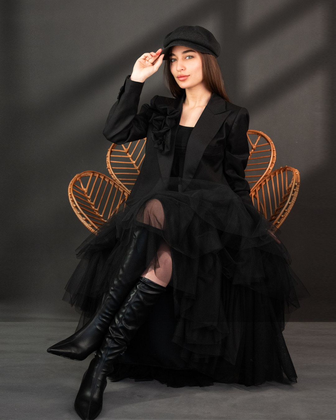 سترة قصيرة (Cropped Blazer) بقصّة أنيقة وخطوط نظيفة، مصنوعة من خامة ناعمة عالية الجودة تعطي شكل مرتب وثابت طول اليوم، مع تفاصيل ناعمة تضيف لمسة فخمة بدون مبالغة.